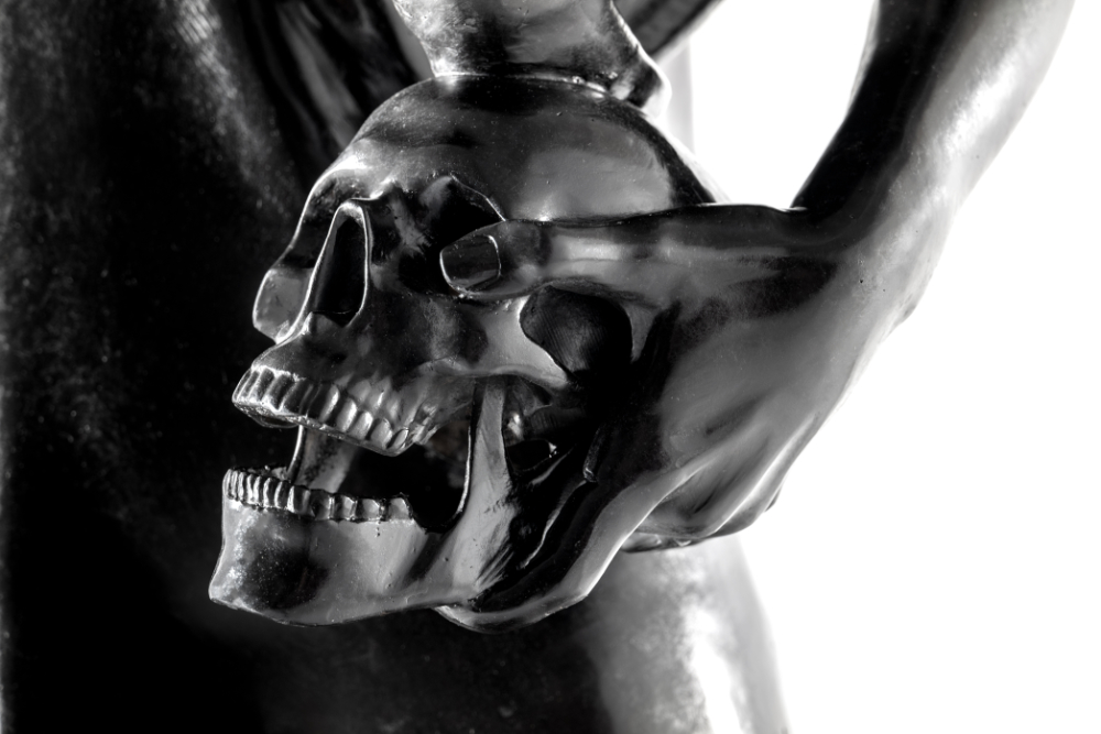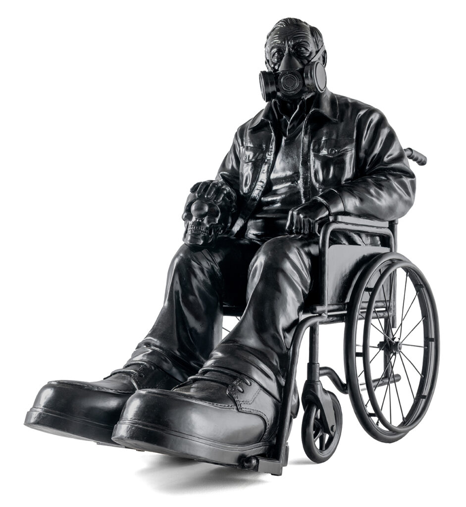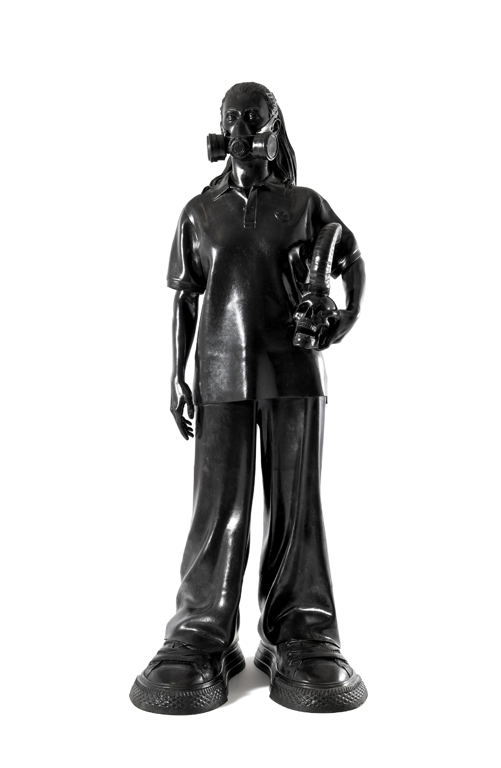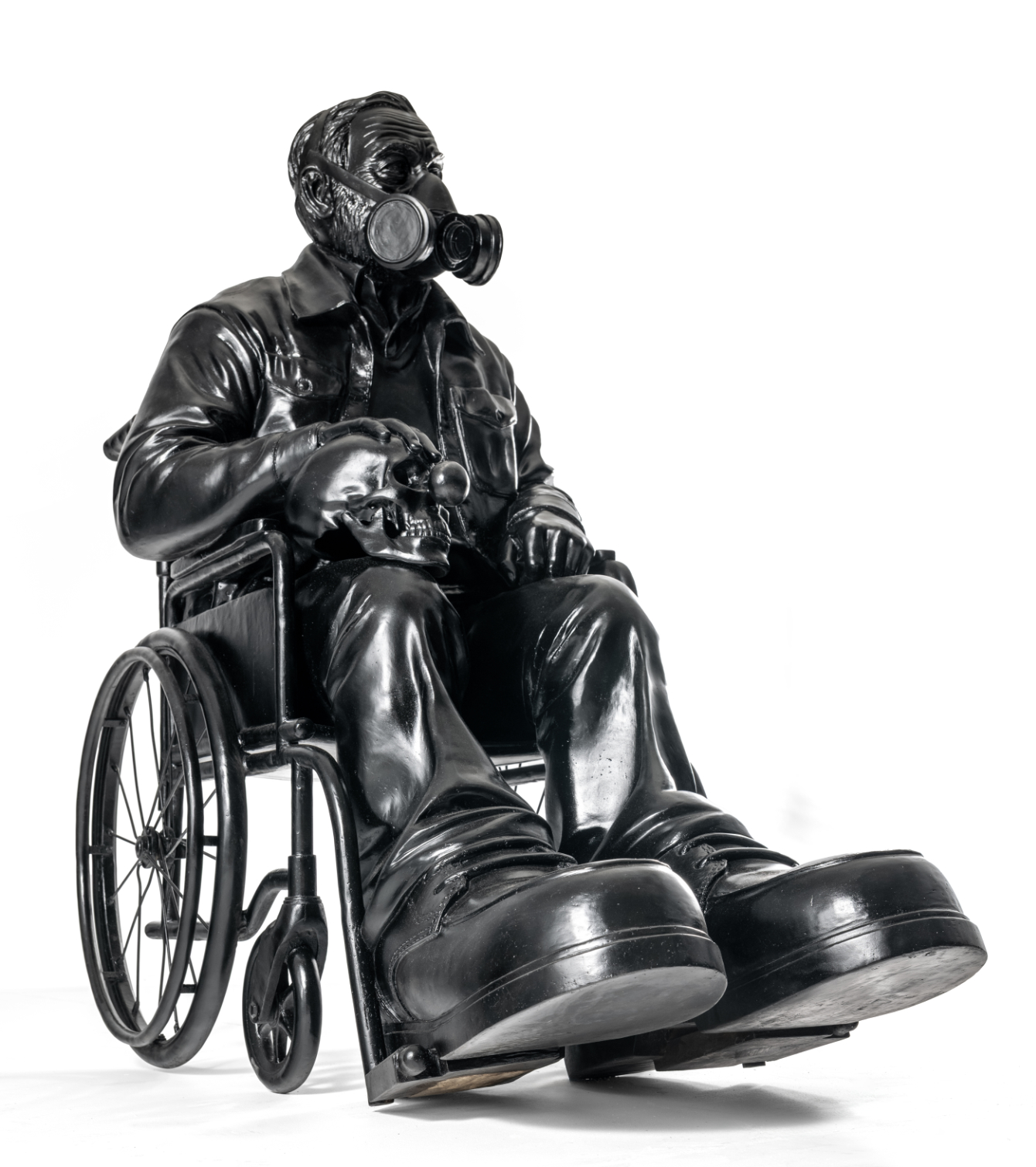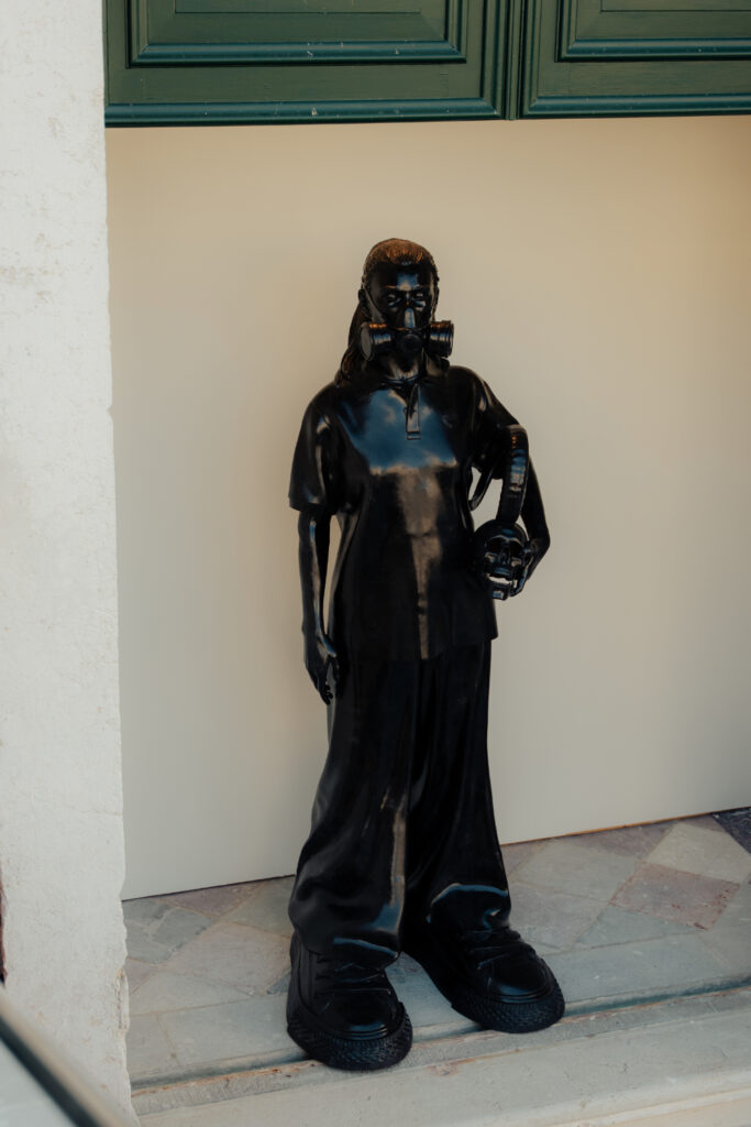 Bronze sculptures transform time into a solidified form, while figures wearing gas masks carry the crises of our era within their bodies. Skull and fish forms reveal the tension between mortality and continuity.